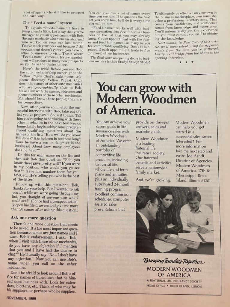 Once you have a foundation, the next step is prospecting. Prospecting is where preparation meets action. In my early years, I used every available resource to identify businesses that could benefit from insurance coverage. I reviewed my own client records, keeping track of businesses my family clients worked with. I observed companies during my daily routines, noting new business signage and companies mentioned in newspapers or local publications.